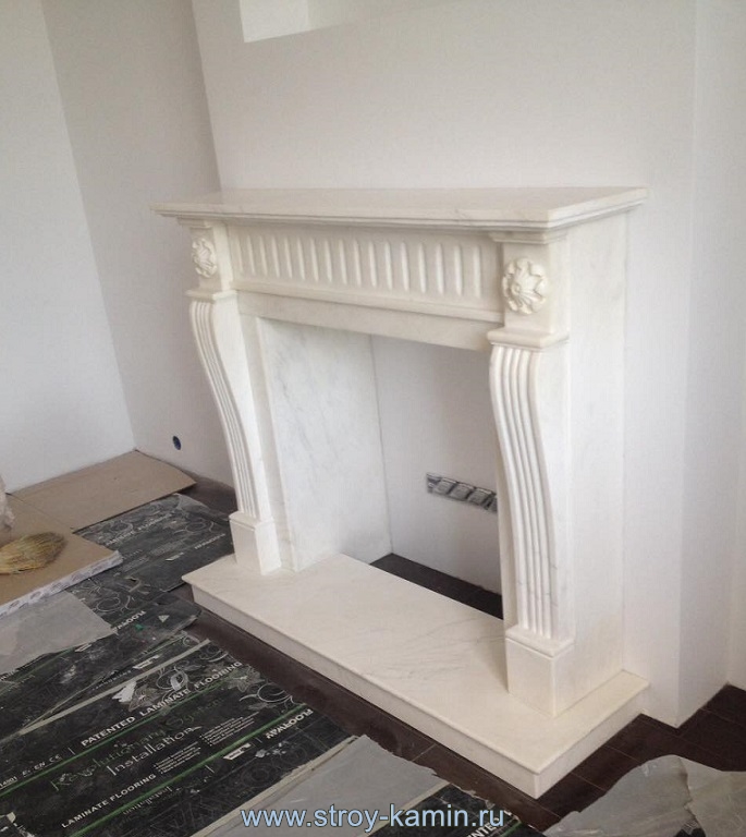 Белый мраморный портал Vesta (ArteVero) установлен под биокамин на Солянке