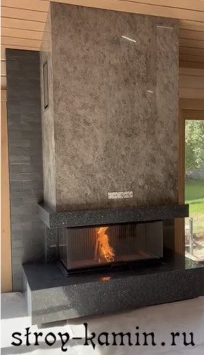 Как красиво украсить гостиную загородного дома современным авторским камином с трехсторонней топкой